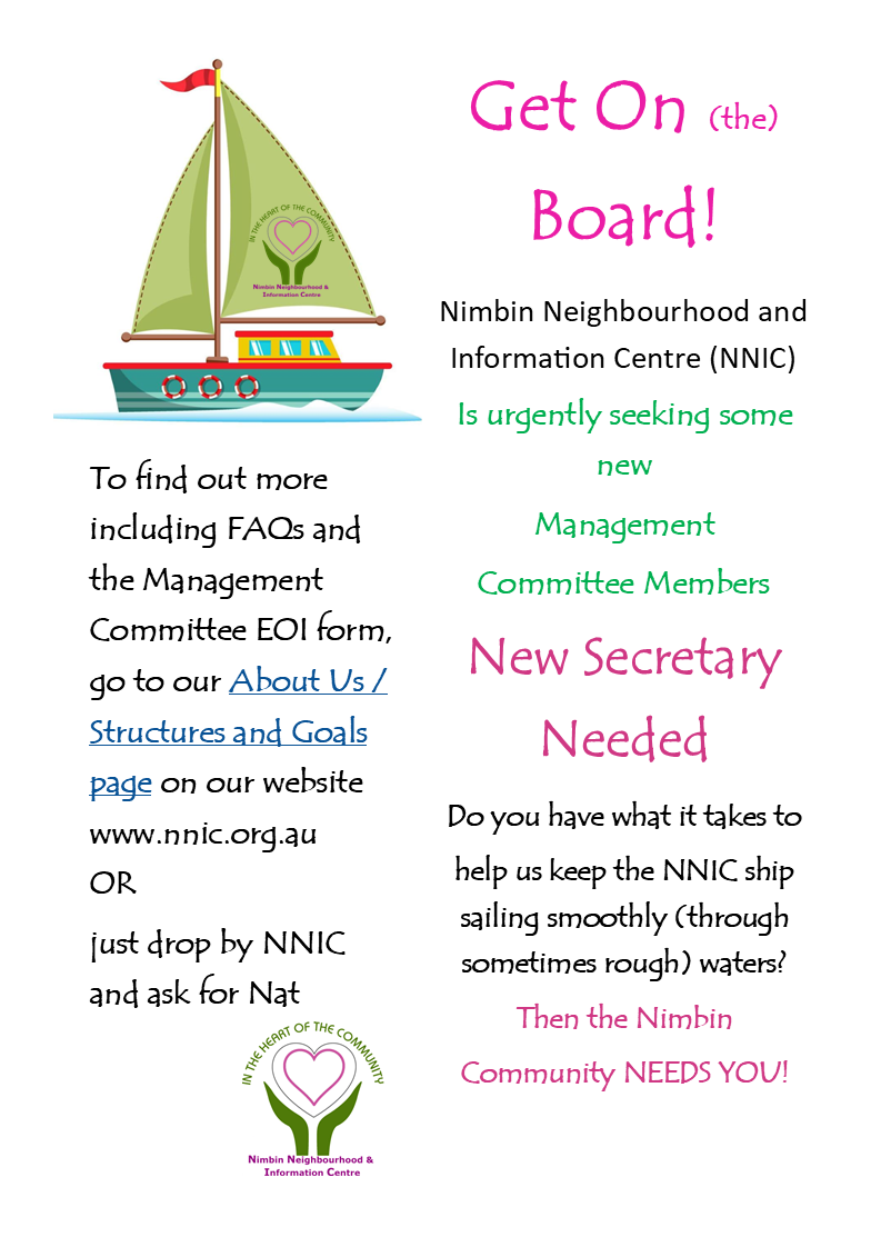 Get on Board! NNIC is looking for people to join our wonderful management Committee to help keep NNIC thriving and doing what we do in our community. This year we have seen/will see the retirement of some of our MC members who have been involved for many years and have earned their rest! In particular we are looking for someone to take on the Secretary role next year, and fill some vacant positions on our MC as Ordinary members. To find out more including FAQs and the MC EOI form, go to our About Us / Structures and Goals page on this website.
